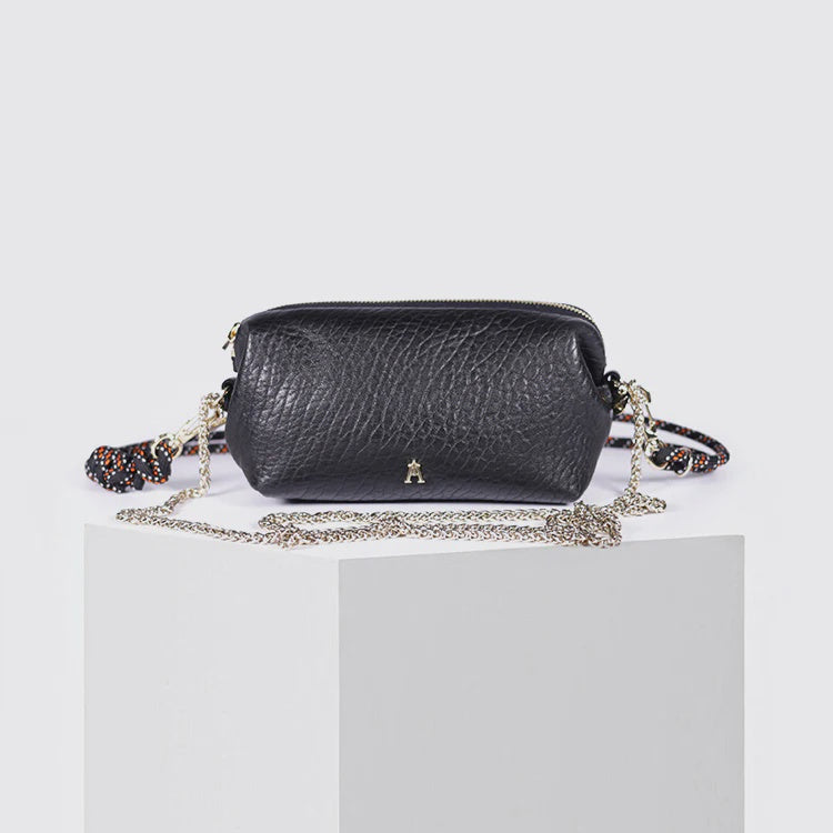 The Nuage bag in the softest leather, by Craie Studio is our new favoutite bag. The perfect small size bag for a long summer lunch with the bright rope strap or an evening cocktail party with the gold chain strap. The rope strap is adjustable, while the chain strap measures 120cm.