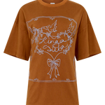 The Amante Tee is the signature KC shape with a romantic edge. Crafted from soft cotton jersey in a rich earthy tone, this oversized graphic t-shirt features a delicate linework illustration of doves, florals and ribbon motifs framing Kinga Csilla hand writing.
