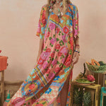 The Aphrodite Gown in Rose channels bold romanticism with its striking print inspired by effortless freedom. Raglan sleeves and a soft V-neck create a flattering frame, while the self neck tie with beaded ends adds a touch of daring detail. A dropped waist seam and side hem splits enhance movement, making this gown a fearless statement of elegance and ease.