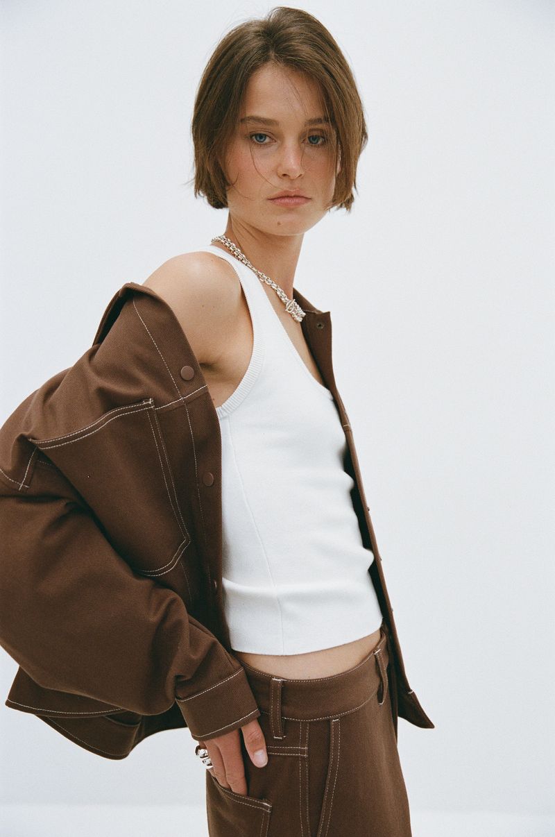 A cotton jacket designed with a boxy fit for a structured, modern silhouette. Made from 100% cotton, it has a firm feel that holds its shape. Metal snap buttons, hidden front pockets and contrast stitching add a functional, workwear-inspired finish.