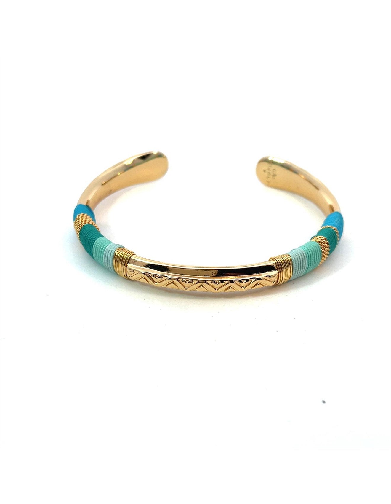 This exquisite Gas Massai Bracelet is crafted with a gold-plated bangle and wrapped in a captivating blend of threads and gold wire. Its elegant combination of organic and mineral materials will transport you on a journey of refined beauty.