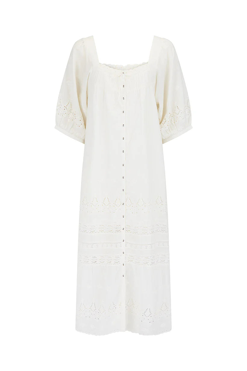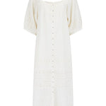 The Maiden Lace Midi Dress in Antique White whispers vintage charm with a cheeky contemporary edge. Rendered in custom Anglaise—100% organic cotton voile—this dress embraces nostalgic femininity through its square neckline, billowing elbow sleeves, and delightful gather inlay details. Front buttons and neck ties invite playful styling, while the midi cut, lined to mid-thigh, moves with ease and grace. A timeless piece that celebrates the art of looking effortlessly put-together.