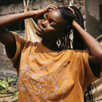 The Amante Tee is the signature KC shape with a romantic edge. Crafted from soft cotton jersey in a rich earthy tone, this oversized graphic t-shirt features a delicate linework illustration of doves, florals and ribbon motifs framing Kinga Csilla hand writing.