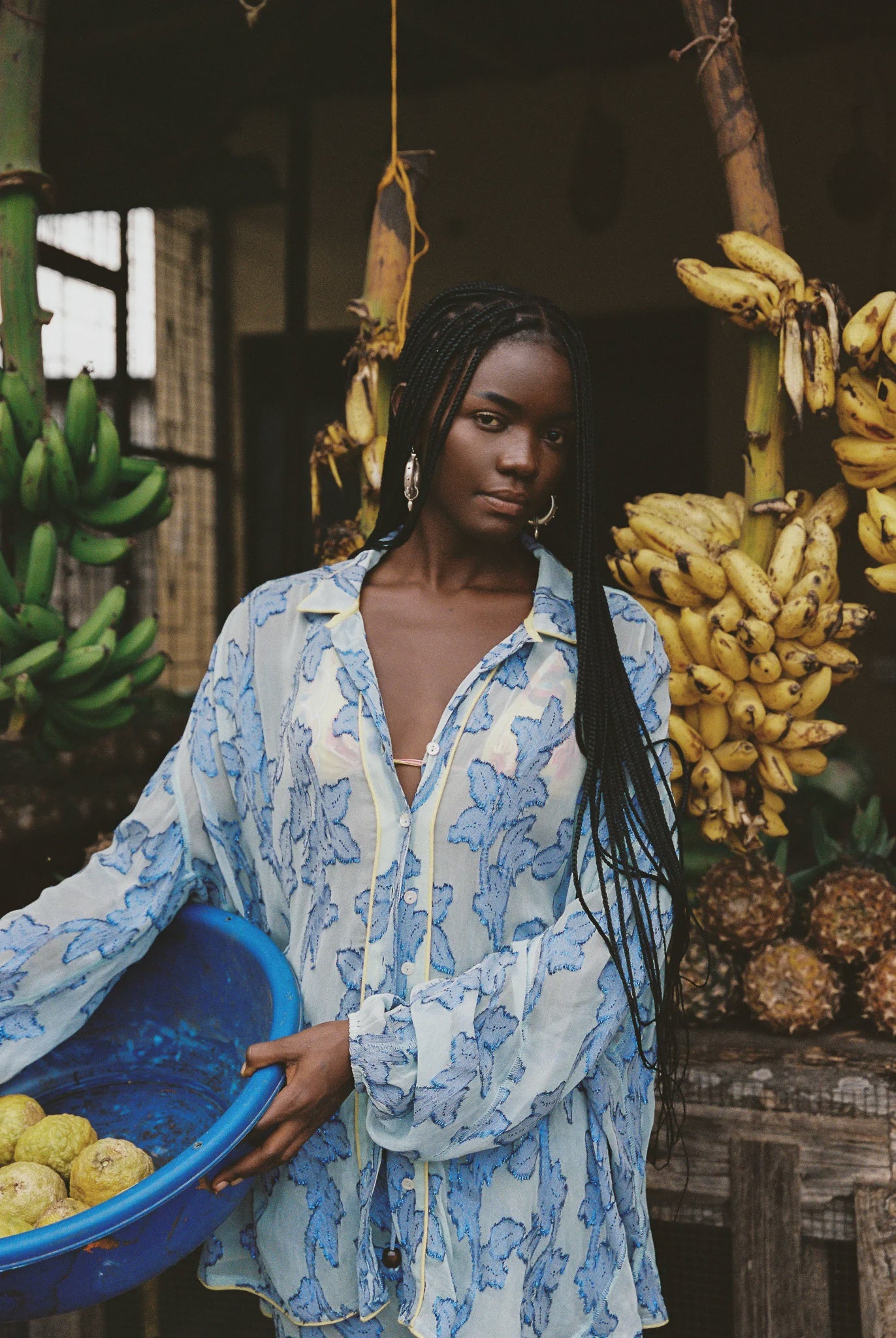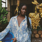 The Verde Chalm Shirt is an elevated take on a classic button-down, reimagined in a sheer, lightweight fabric embroidered with bold botanical motifs in shades of electric blue. With its oversized fit, curved hemline and billowing sleeves, this statement blouse blends relaxed tailoring with an edge. Subtle contrast piping frames the design, adding a touch of detail that makes this piece feel special.