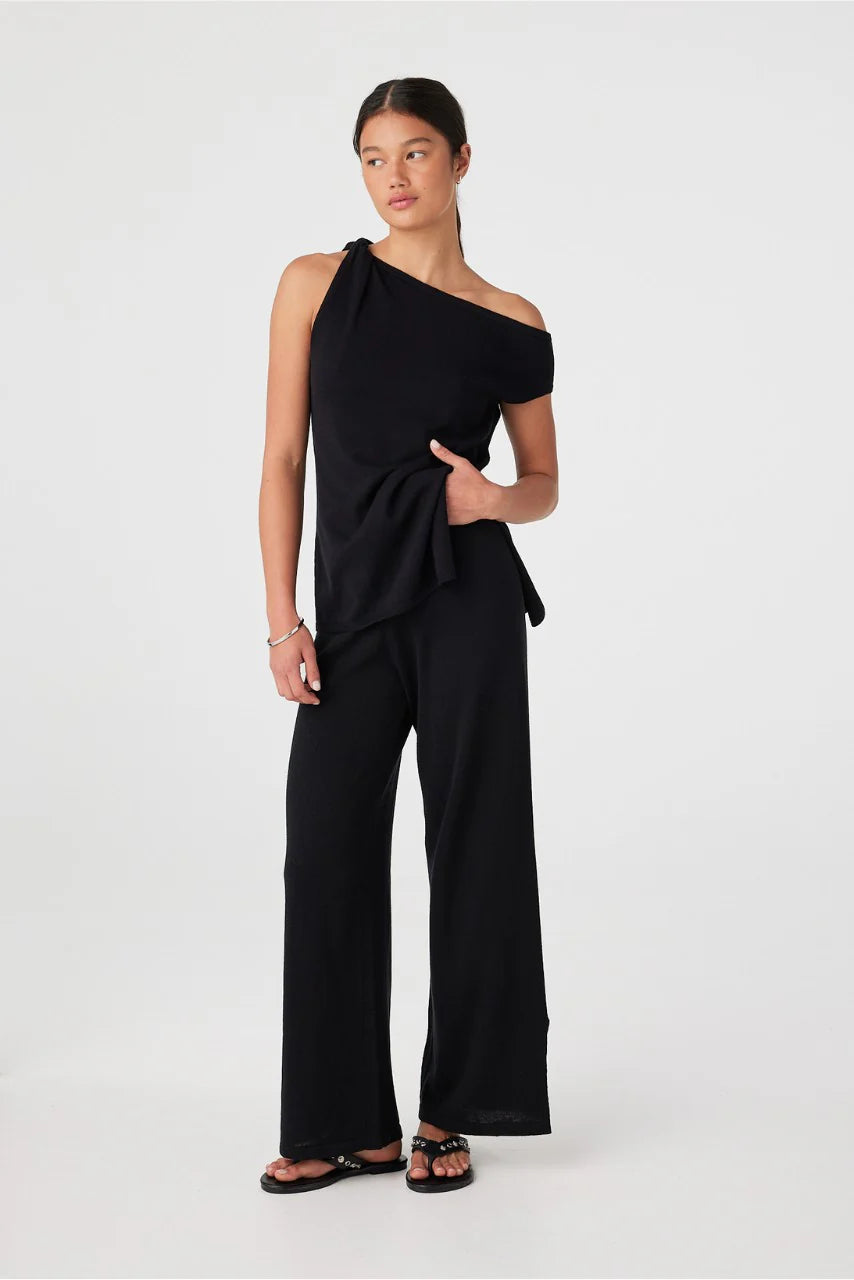 Asymmetrical longline knit top in 100% cotton. Cut to sit off one shoulder with a relaxed straight body and a twist and slit detail at the side. Soft on the skin and breathable for warm days, easy to layer with pants, skirts or over a swimsuit.