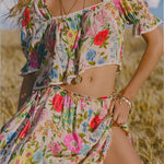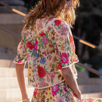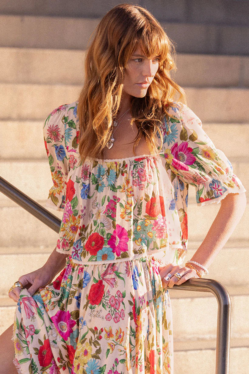 Our Valley of the Dolls Short Sleeve Blouse in soft Opal is crafted from a blend of 50% organic cotton and 50% LENZING™ ECOVERO™ viscose and features a cropped, generously gathered body, delicate contrast lace trim, and elasticated sleeves for a relaxed, romantic fit. Style it with the matching Valley of the Dolls Maxi Skirt for a cohesive whimsical look, or pair with Spell denim for an effortlessly chic everyday ensemble.