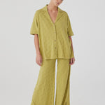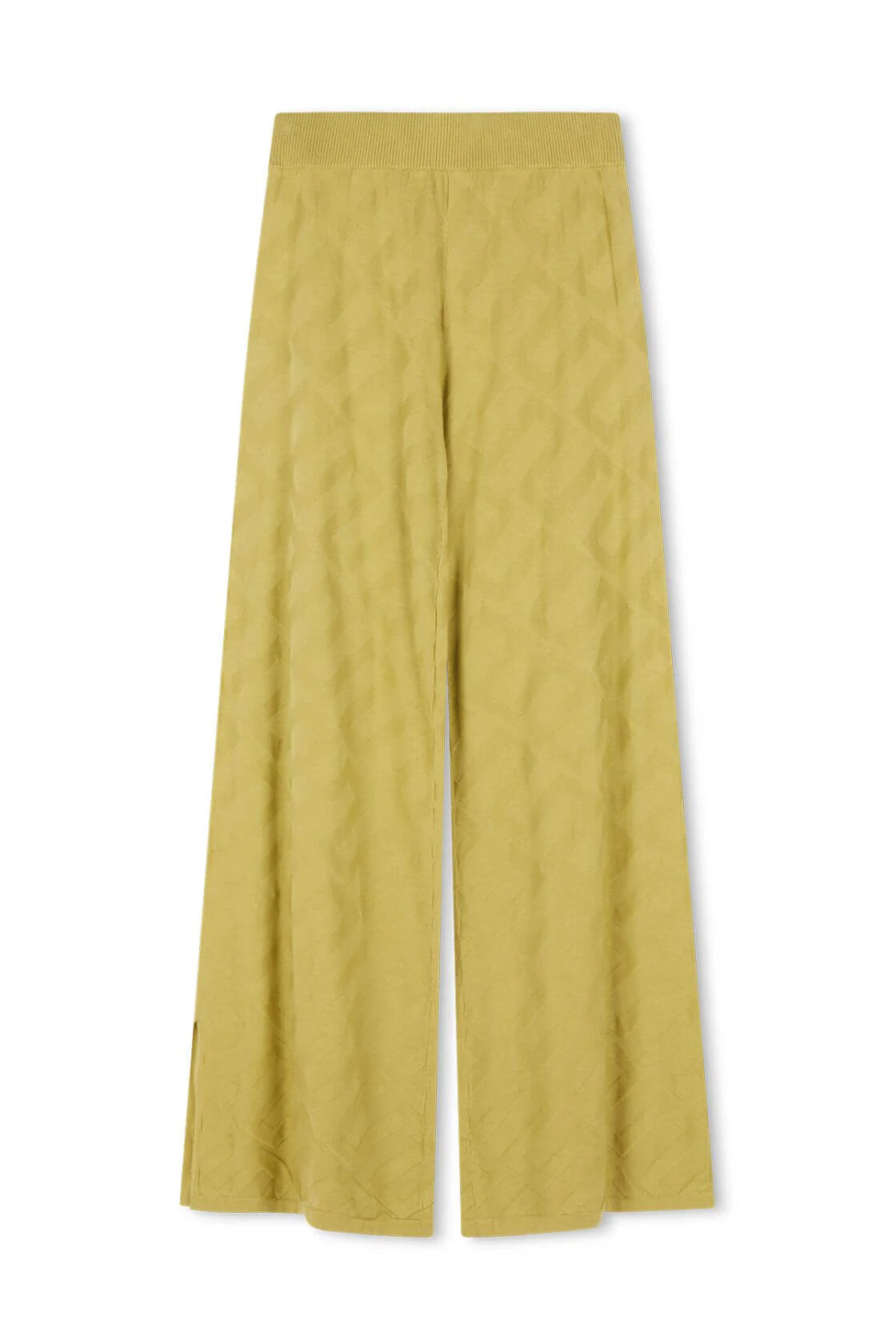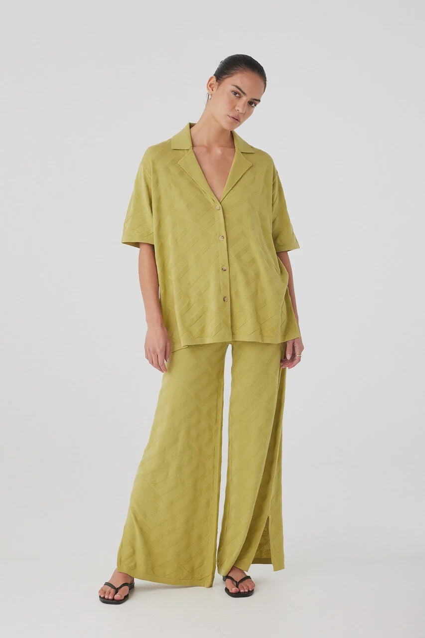 The Aria Pant in Matcha offers a relaxed wide-leg silhouette in a refreshing green tone. Crafted from 100% organic cotton, the lightweight patterned knit creates natural breathability, while side splits and a ribbed elastic waistband add ease and fluidity. Designed for effortless transitions from coastal days to everyday wear.