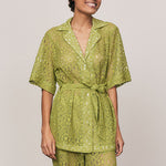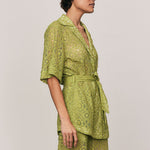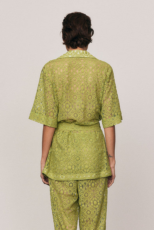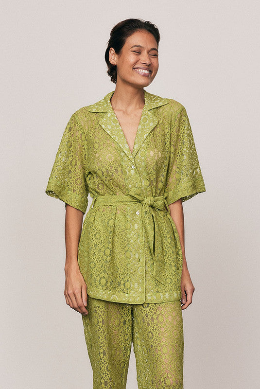 A best-selling Bohemian Traders silhouette, reimagined in vibrant Citron lace. Worn by women of influence globally, this softly structured shirt features a relaxed fit, shell buttons and a self-tie waist. Crafted from a premium cotton blend lace, it delivers effortless elegance and everyday ease. Match it with the coordinate shirt.
