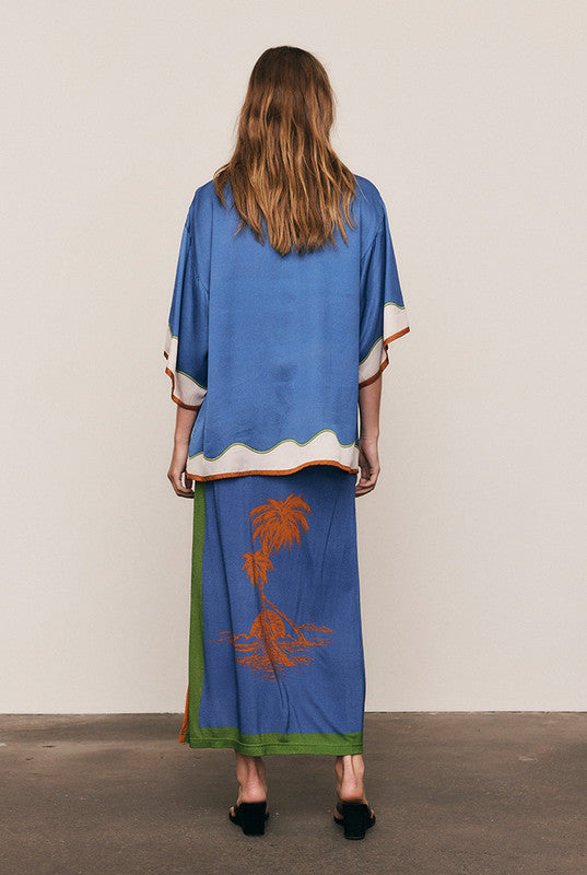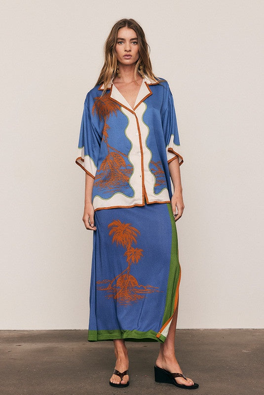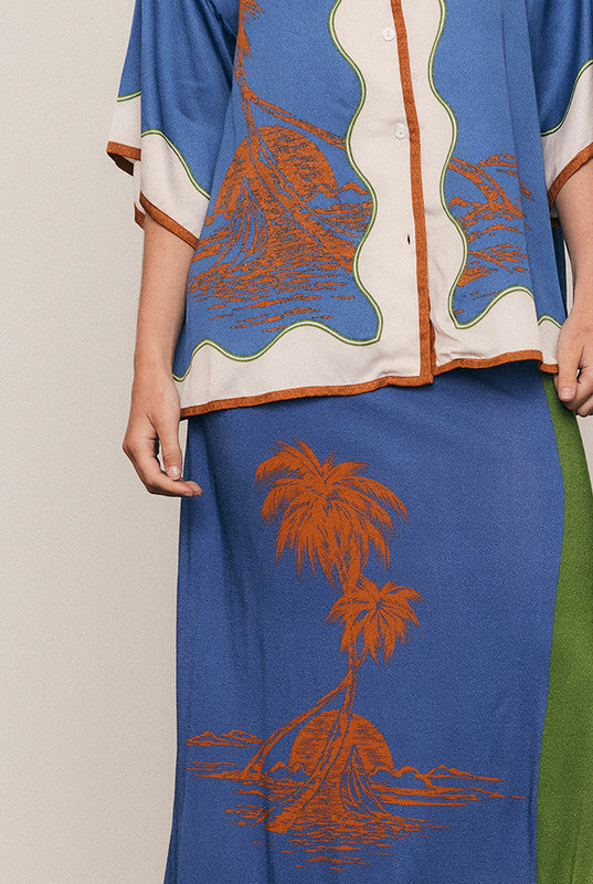 Sleek and effortless, this Viscose Jersey Skirt is crafted from silky viscose with a Bohemian Traders exclusive placement print. Cut straight with an elegant side split, it skims the body with soft drape and gentle movement. Lightweight and versatile, it transitions beautifully from relaxed days to golden summer evenings with ease. Pair it with the matching shirt.
