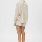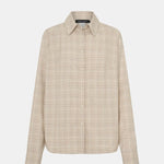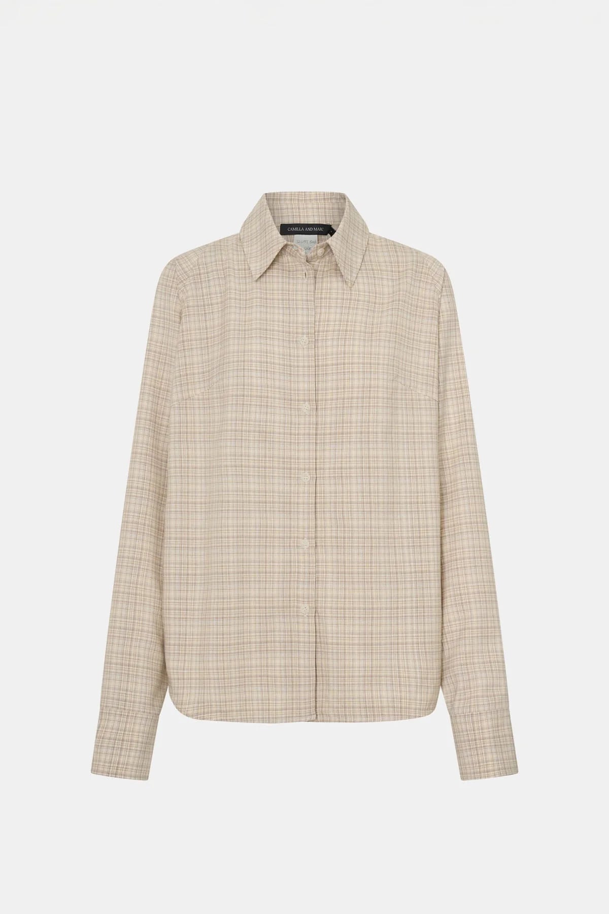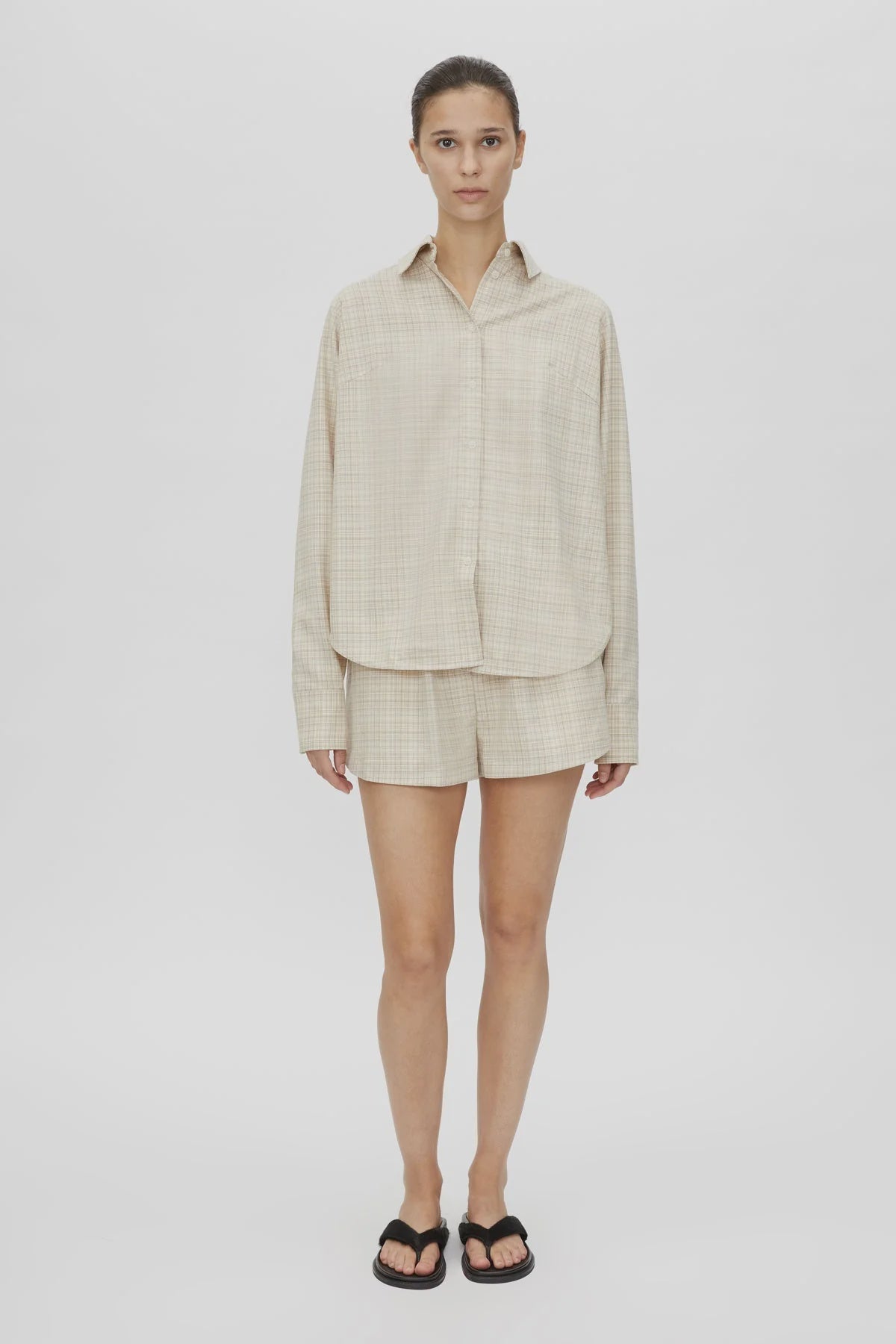Modulo boxy cocoon shape shirt in sand check. Bust darts, corozo button placket, dropped sleeves.