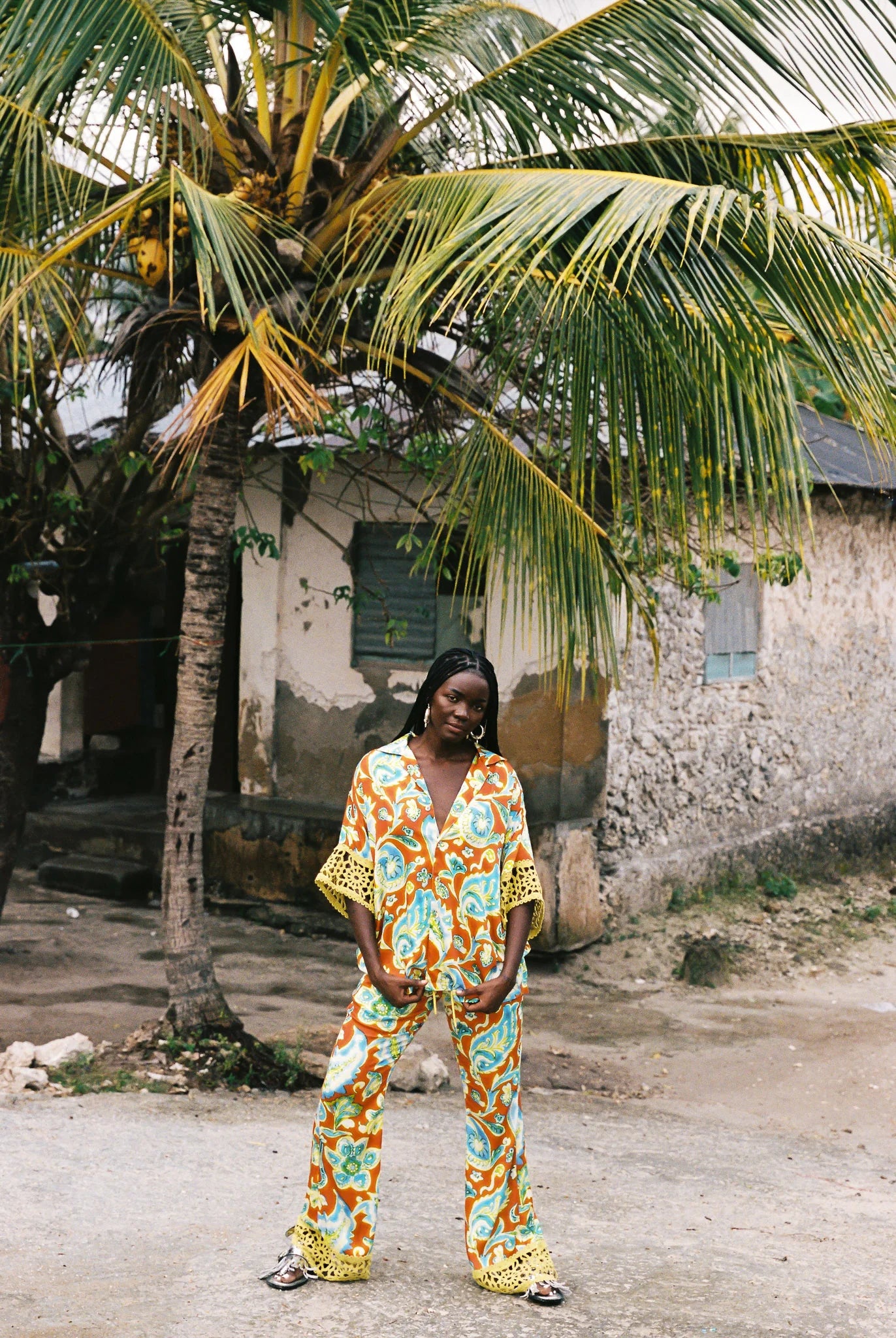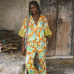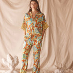 The Brezza Luna Flare is a bold expression of bohemian resort style, cut in a silky fabric that flows effortlessly with every step. Featuring a vibrant retro floral print in sunset orange, aqua, and lime, these high-waisted flare pants are finished with intricate crochet lace trim at the hem for a touch of artisanal detail.